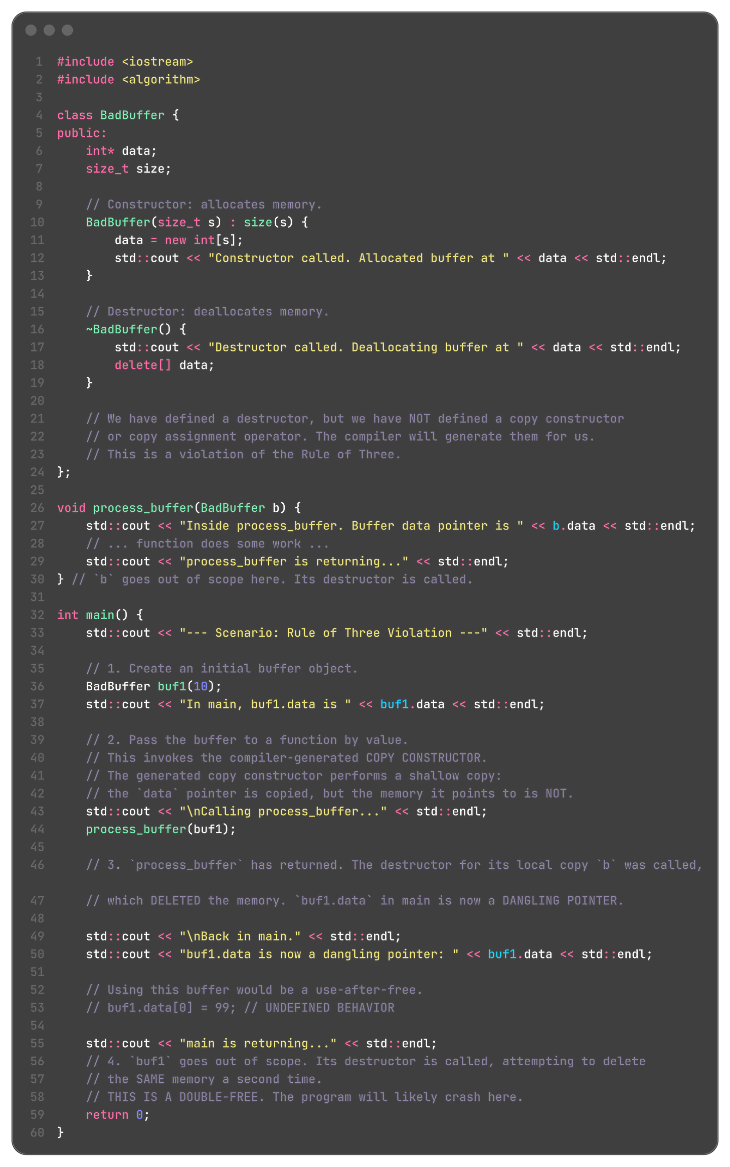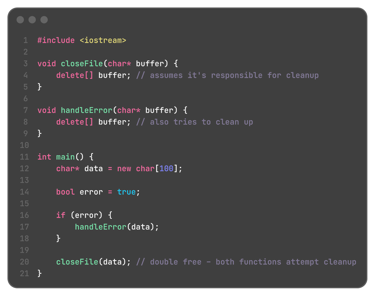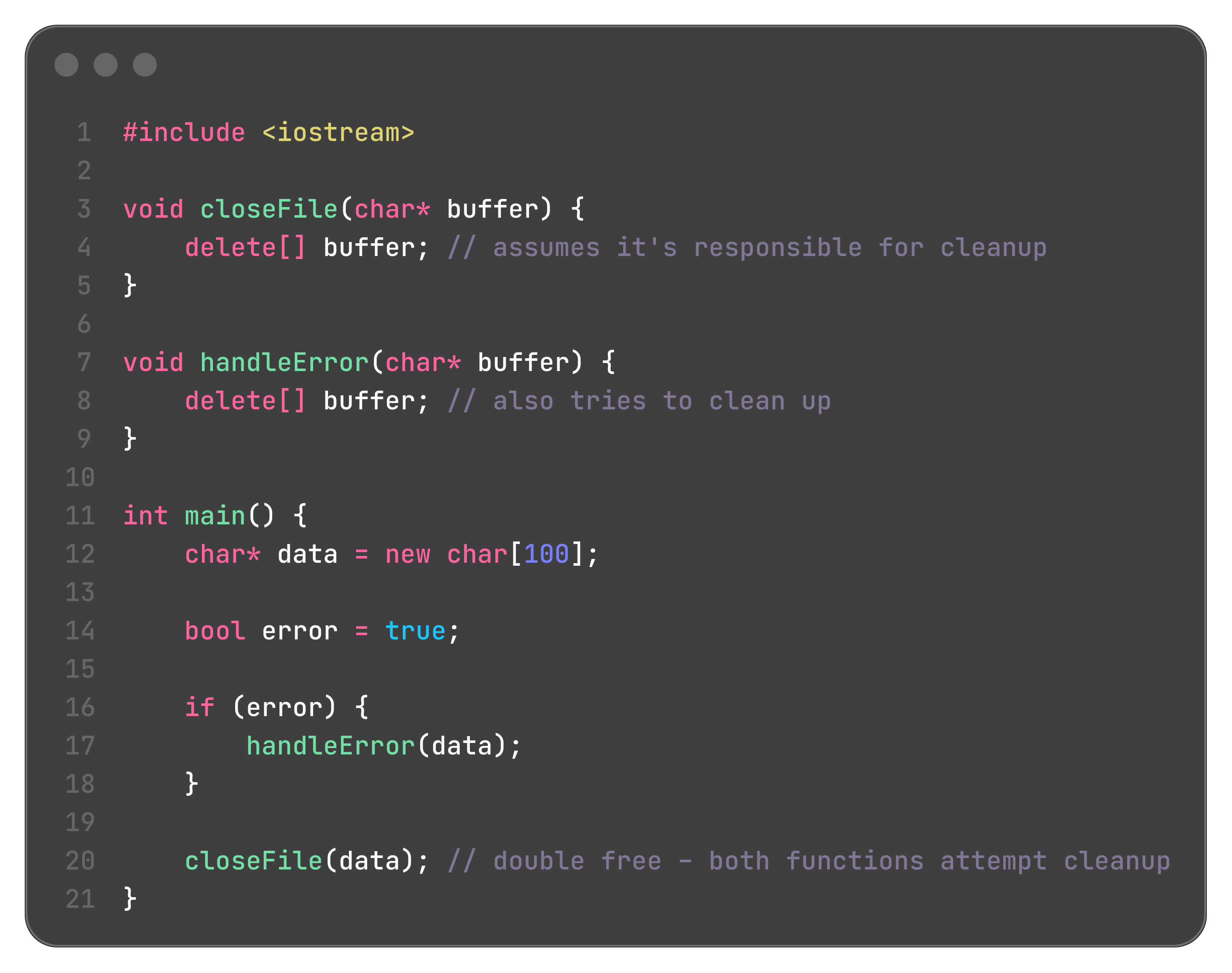 A double-free bug occurs when you call free() (or delete) on the same pointer more than once. This typically happens when multiple functions assume they “own” the pointer and each one tries to free it.