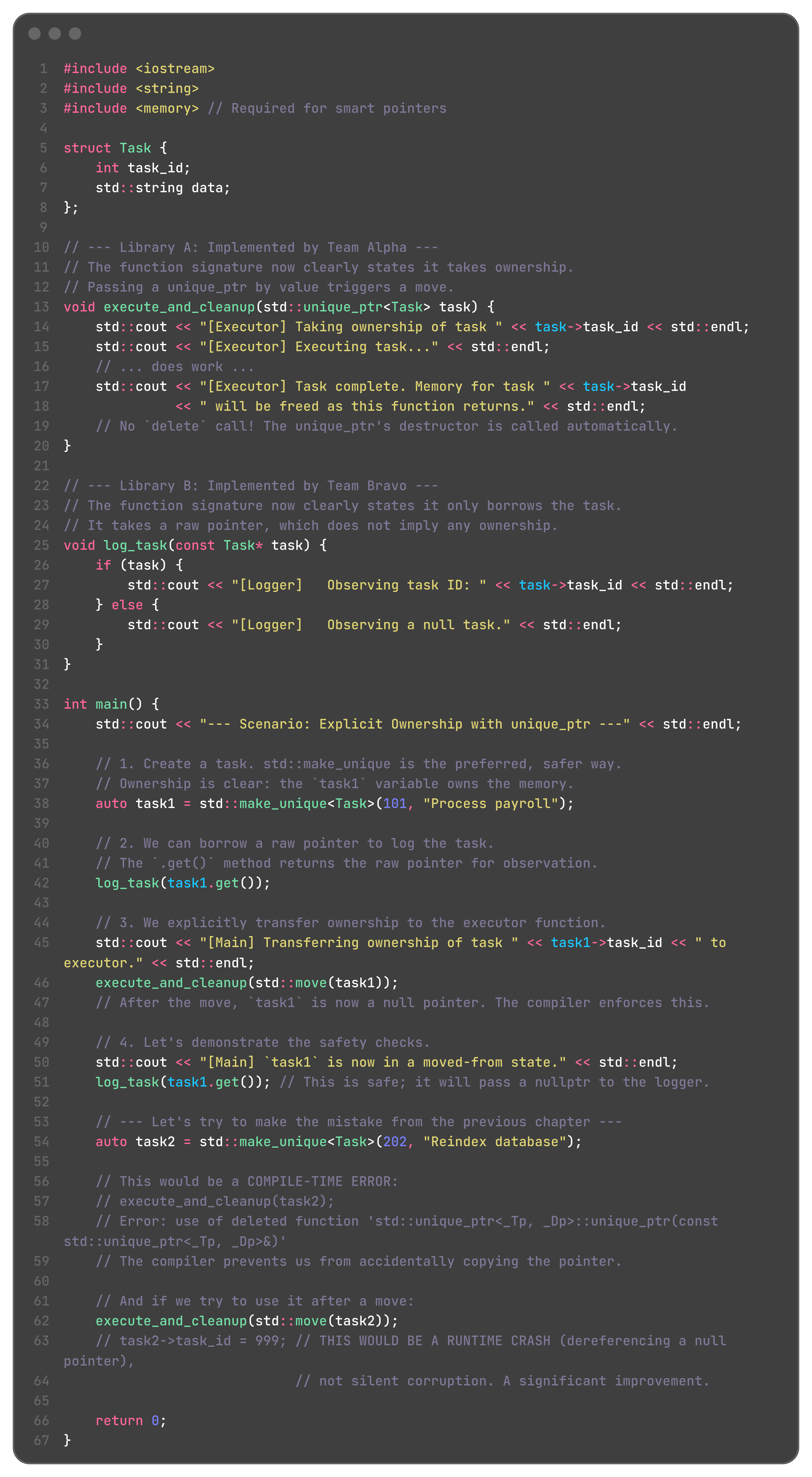 it still doesn’t solve the problem completely. suppose while borrowing the pointer you call delete on it accidentally then you will get into the use-after-free error