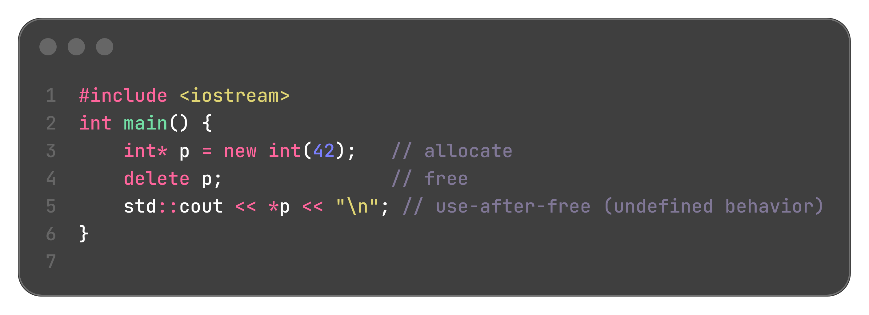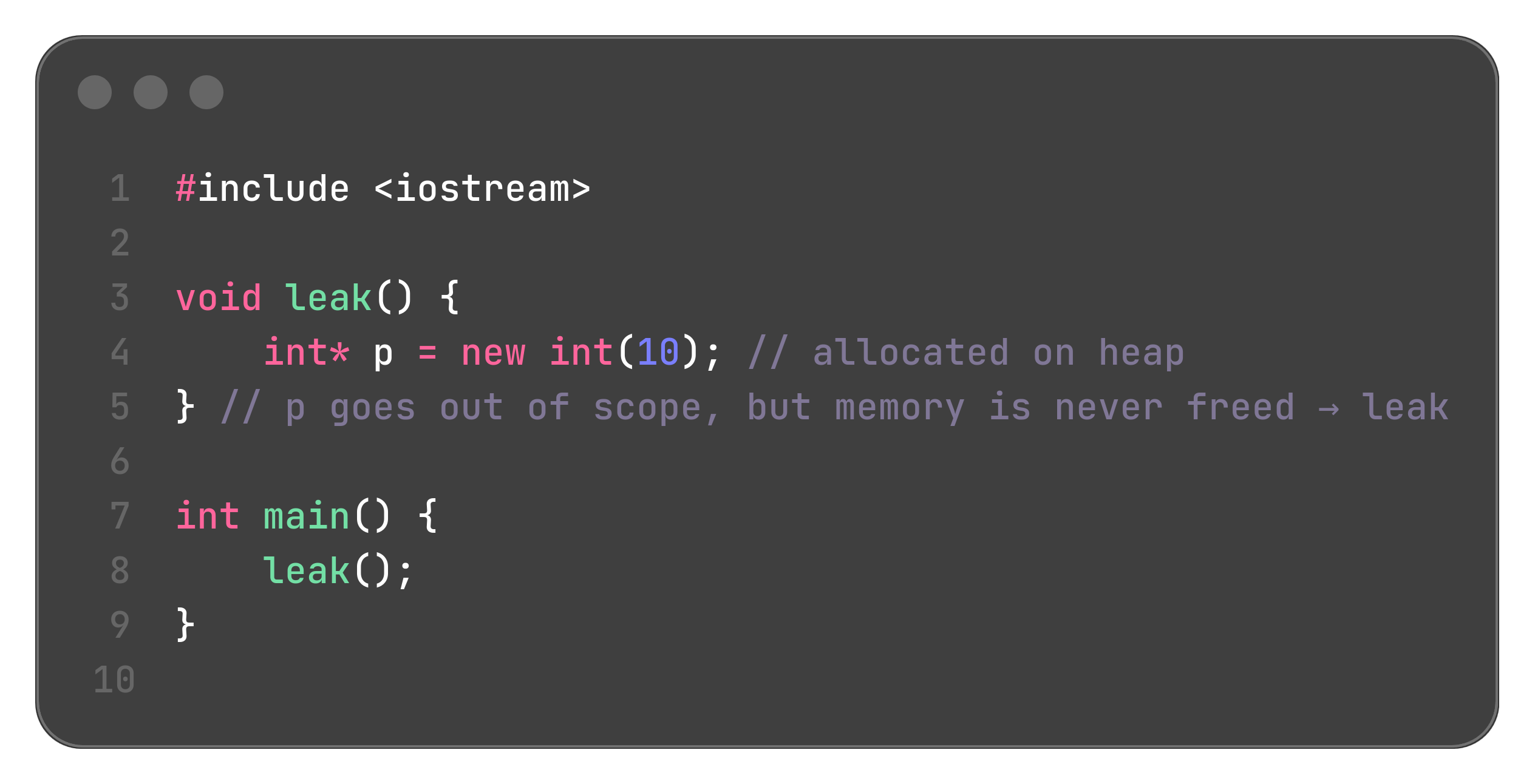 you typically allocate memory using a pointer inside a local scope (usually inside functions), or indirectly by creating an object that contains a pointer as a member. When the scope ends, the pointer itself (being a stack variable) is destroyed, but the memory it was pointing to is not automatically freed. If you don’t call free() or delete before the scope ends, the allocated memory remains reserved, but you have no way to access it anymore — this is a memory leak.